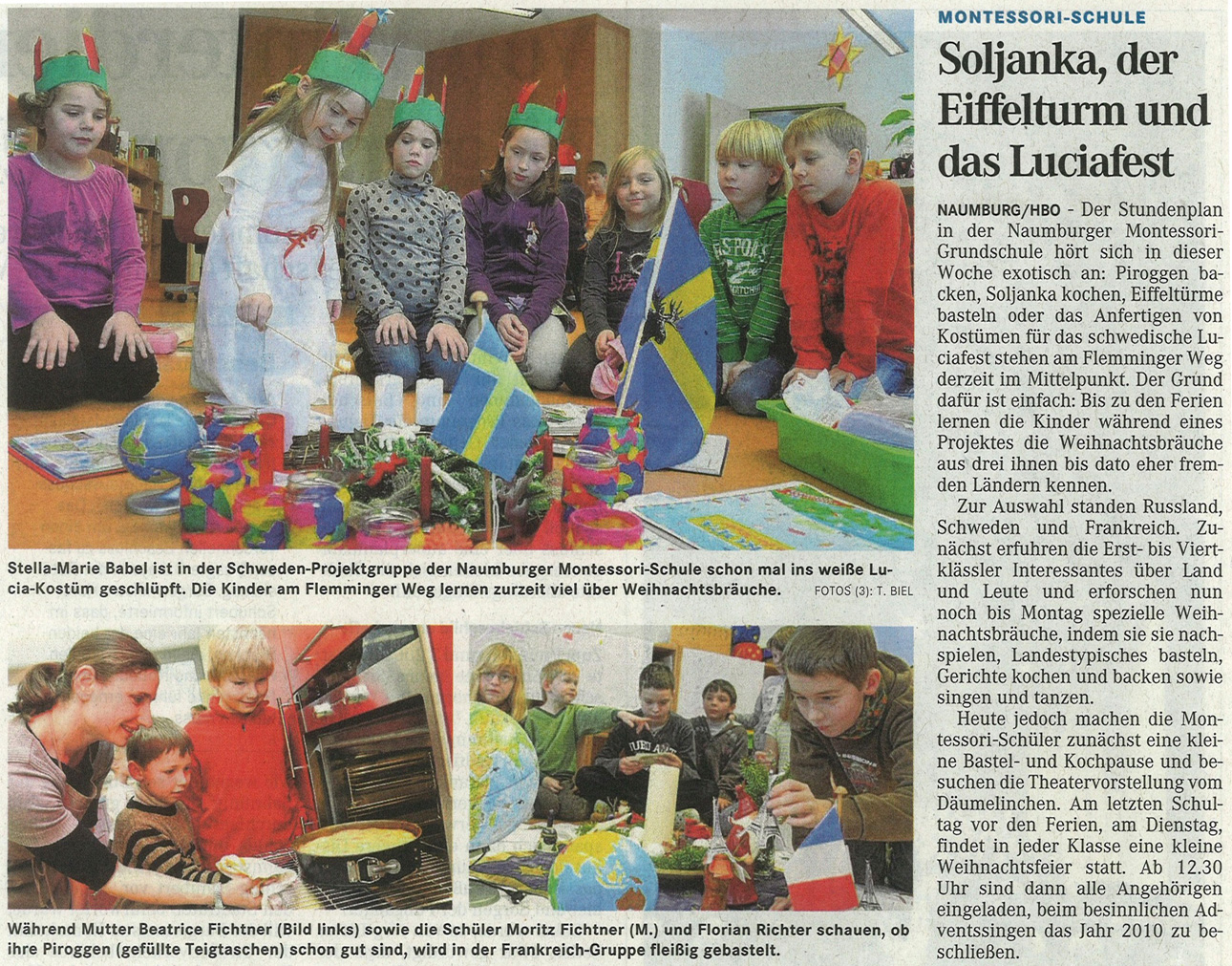 Probenbesuch der neuen Inszenierung "In einem tiefen dunklen Wald". Mitteldeutsche Zeitung, Januar 2011Partnerschule gestaltet Ausstellung im TheaterKinder der Montessori-Schule in Naumburg haben gestern im Foyer des Naumburger Theaters eine Ausstellung aufgebaut. Mitteldeutsche Zeitung, Dezember 2010Soljanka, der Eiffelturm und das LuciafestDie Kinder am Flemminger Weg lernen zurzeit viel über Weihnachtsbräuche. Mitteldeutsche Zeitung, November 2010Annalena ist die Lesekönigin18 Grundschüler messen sich in Weißenfelser Bibliothek im Vortragen von Texten. Mitteldeutsche Zeitung, November 2010Nicht mehr und nicht weniger: 45000 EuroMontessori-Schule in Naumburg lädt zu erstem Tag der offenen Tür und erhält von Lotto-Toto üppige Fördersumme. Mitteldeutsche Zeitung, August 2010Erst Chaos, nun SchmuckstückMontessori-Grundschule am Flemminger Weg wurde nach fünf Monaten Bauzeit eröffnet.