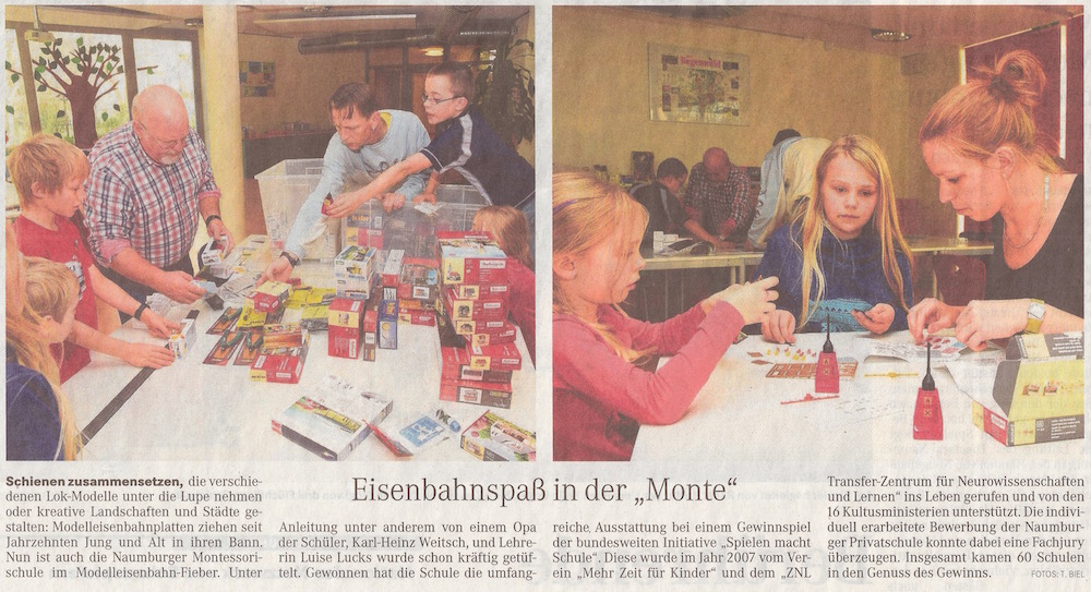 Naumburger Tageblatt, Juni 2017Montessori-Schüler lassen Züge fahrenZur Abfahrt stehen jetzt die Züge afu der Modelbahnanlage in der Naumburger Montessori-Schule bereit. ... Naumburger Tageblatt, Juni 2017Schneiderlein trifft EinhornDie Theatergruppe der Naumburger Montessori-Schule zeigt eine musikalische Version ... Naumburger Tageblatt, Januar 2016Bald auch Montessori-KitaAb August sollen im neu gebauten Schulgebäude am Flemminger Weg 15 Kindergartenkinder ... Naumburger Tageblatt, November 2015Eisenbahnspaß in der „Monte“Schienen zusammensetzen, die verschiedenen Lok-Modelle unter die Lupe nehmen ... Mitteldeutsche Zeitung, Juli 2011Handwerk und StadtgeschichteDer Titel der zwei Projektwochen, die die Naumburger Montessorischüler derzeit erleben ... Mitteldeutsche Zeitung, Juni 2011Gesellen für den MeisterMit einem Fest für Schüler eröffnen die Vereinigten Domstifter die Kinderdombauhütte.